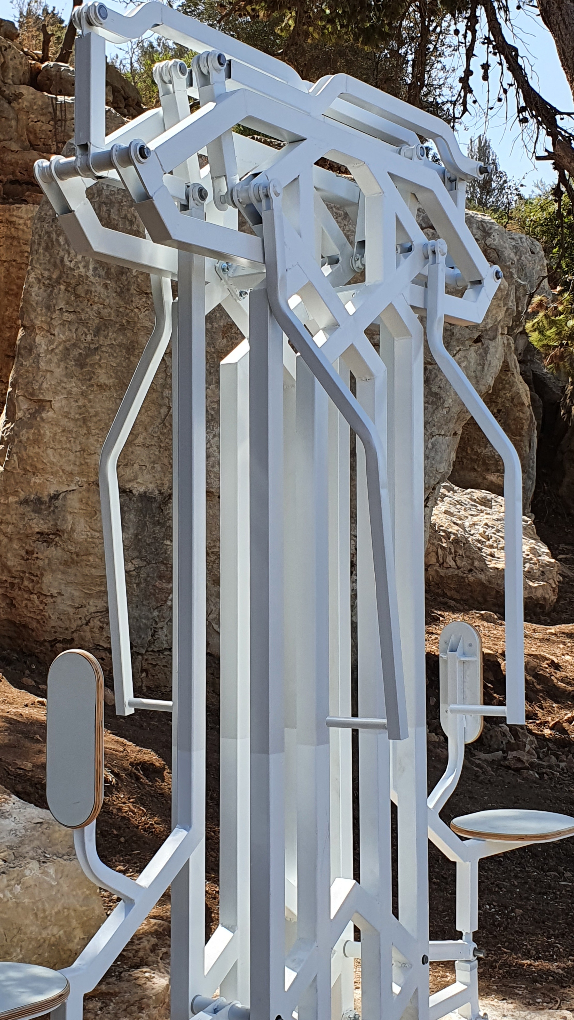 “Conditions, engineered” is the second iteration of a series of interactive public sculptures. The work mimics the aesthetics and mechanics of exercise machines but requires two users to work in tandem in order to be functional, creating this way a condition of dependency between them. Within public space, this condition instigates brief moments of unexpected closeness, hinting towards new ways of perceiving ourselves and others within it.